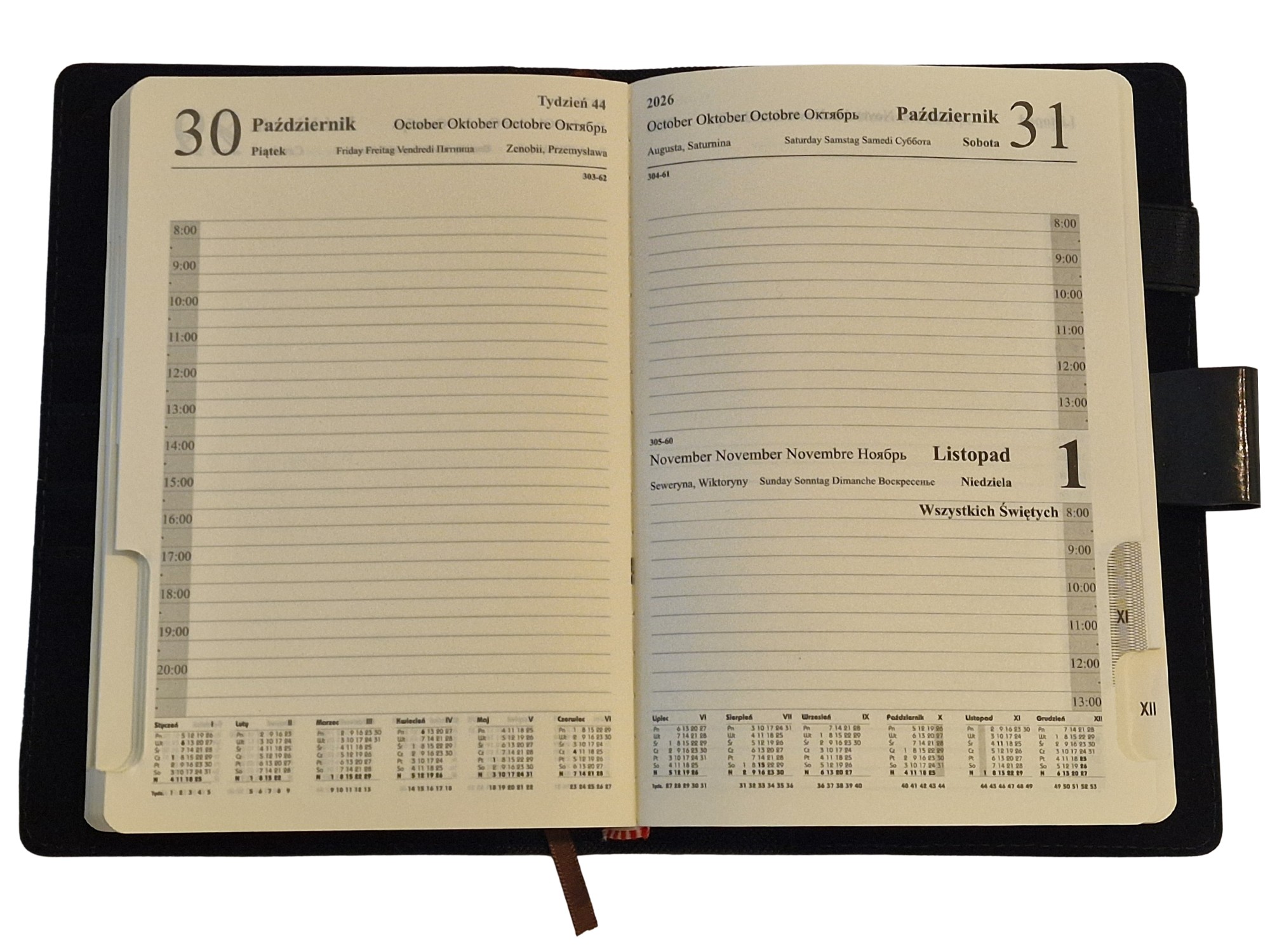 - Układ kalendarza: Dzienny 370 stron lub Tygodniowy 162 strony.