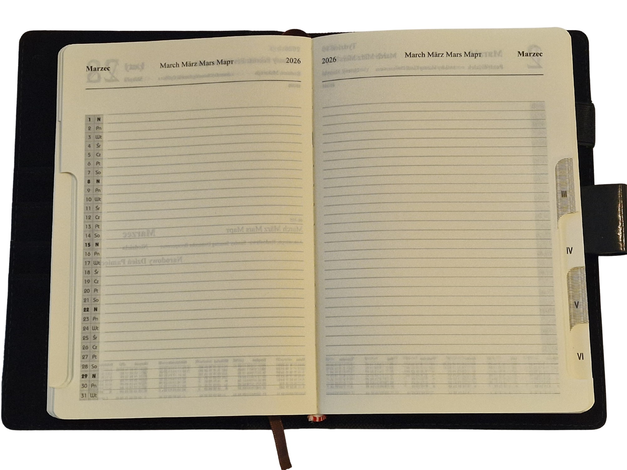 - Dwie dodatkowe strony pomiędzy miesiącami z planem na kolejny miesiąc i na notatki.
