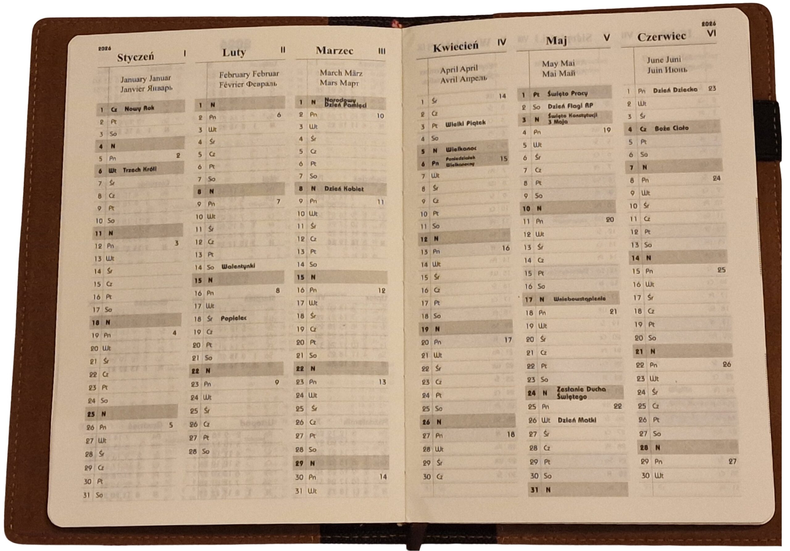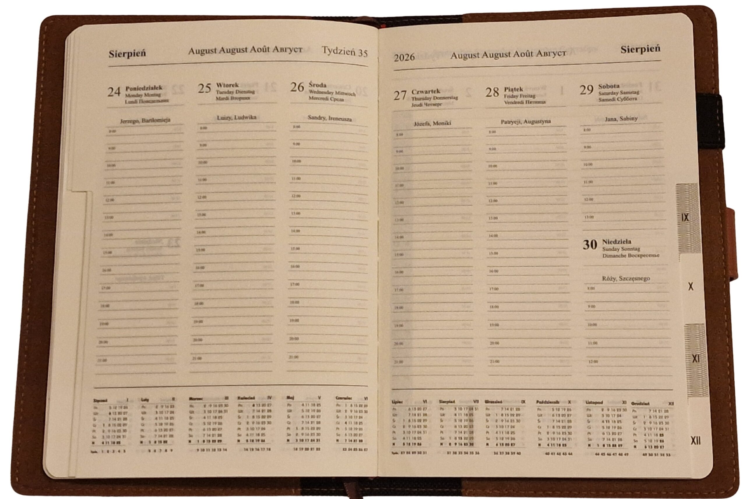 - Układ kalendarza: Dzienny 370 stron lub Tygodniowy 162 strony.