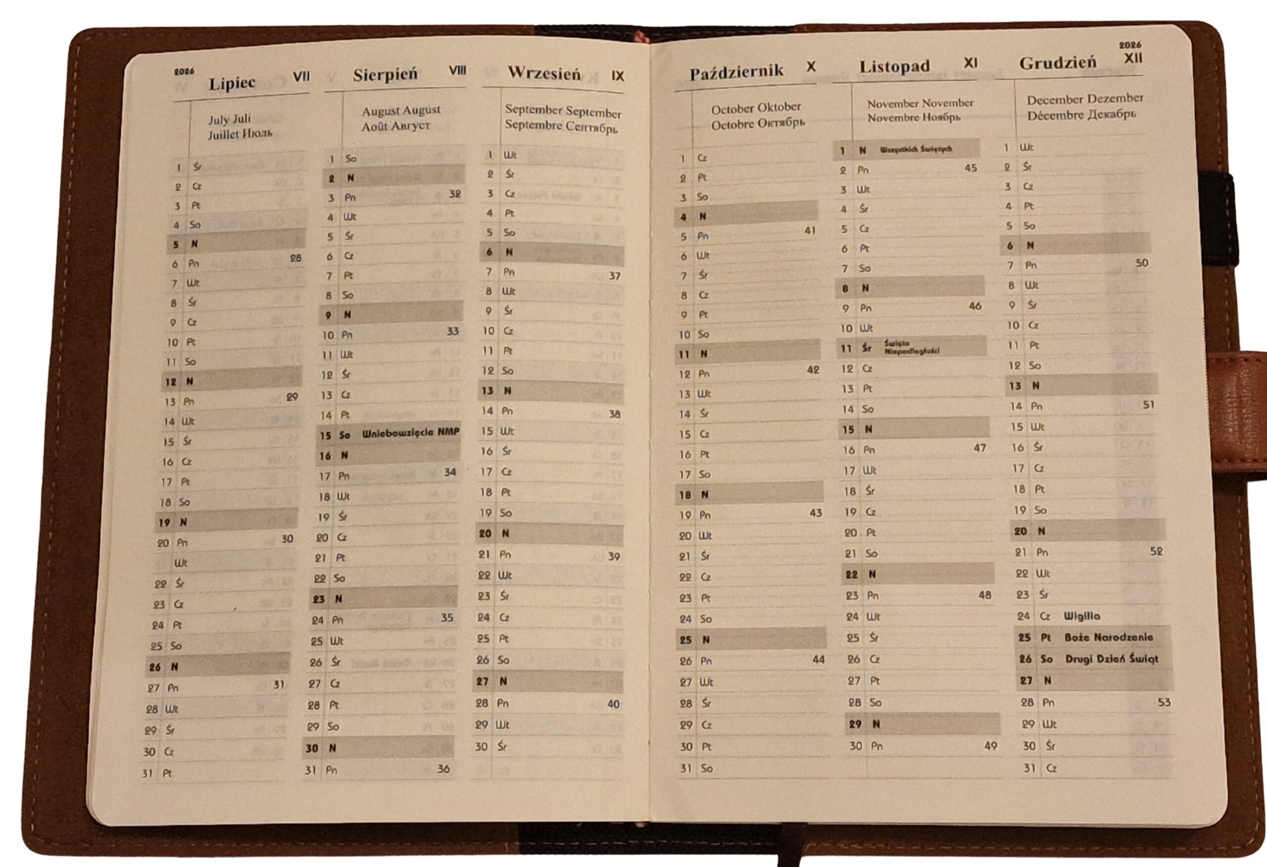 Kalendarz posiada 162 stron układ tygodniowy.