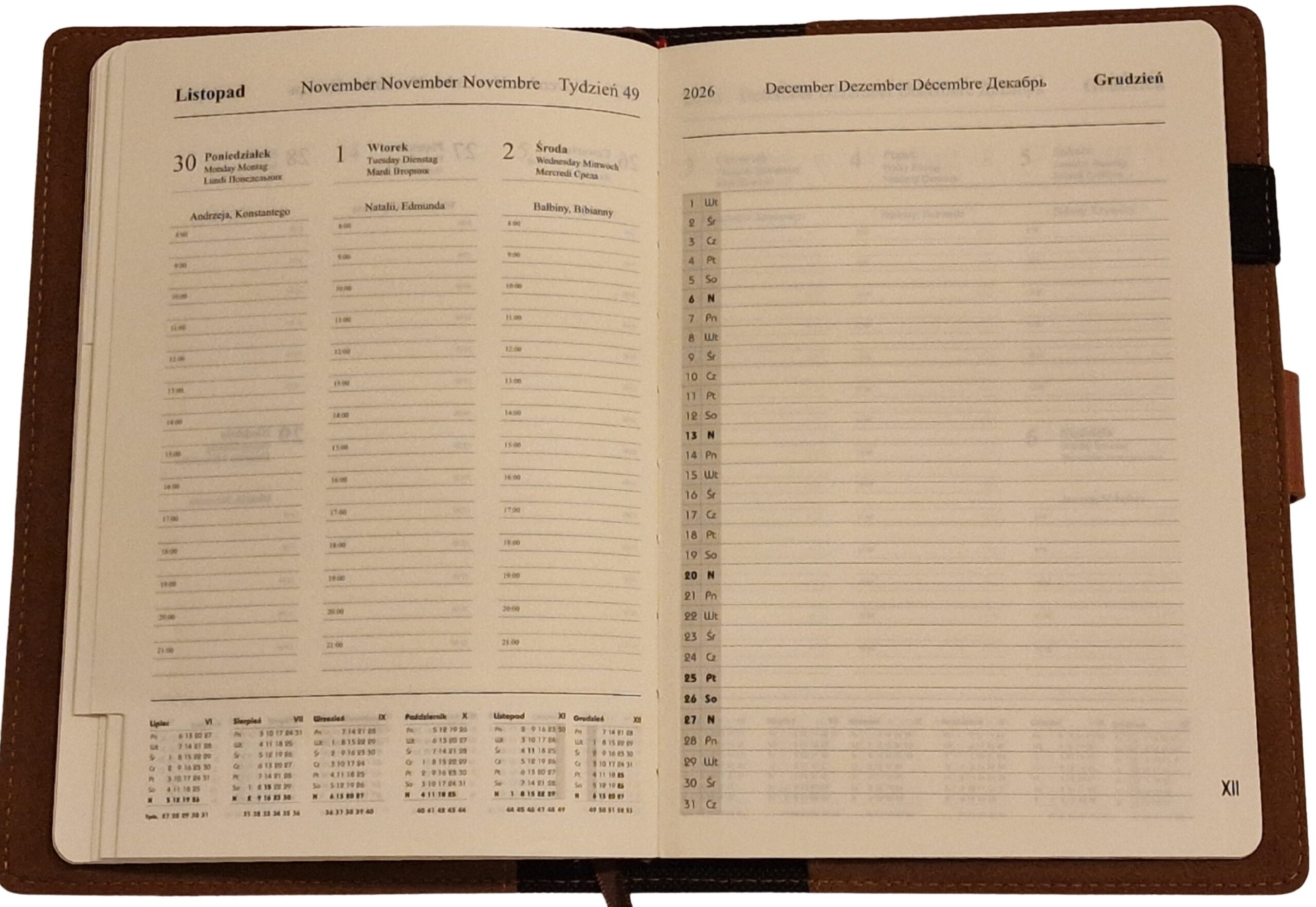 - Dodatkowe strony – na początku każdego miesiąca, notatki i plan na nowy miesiąc, notes teleadresowy, plan roczny.