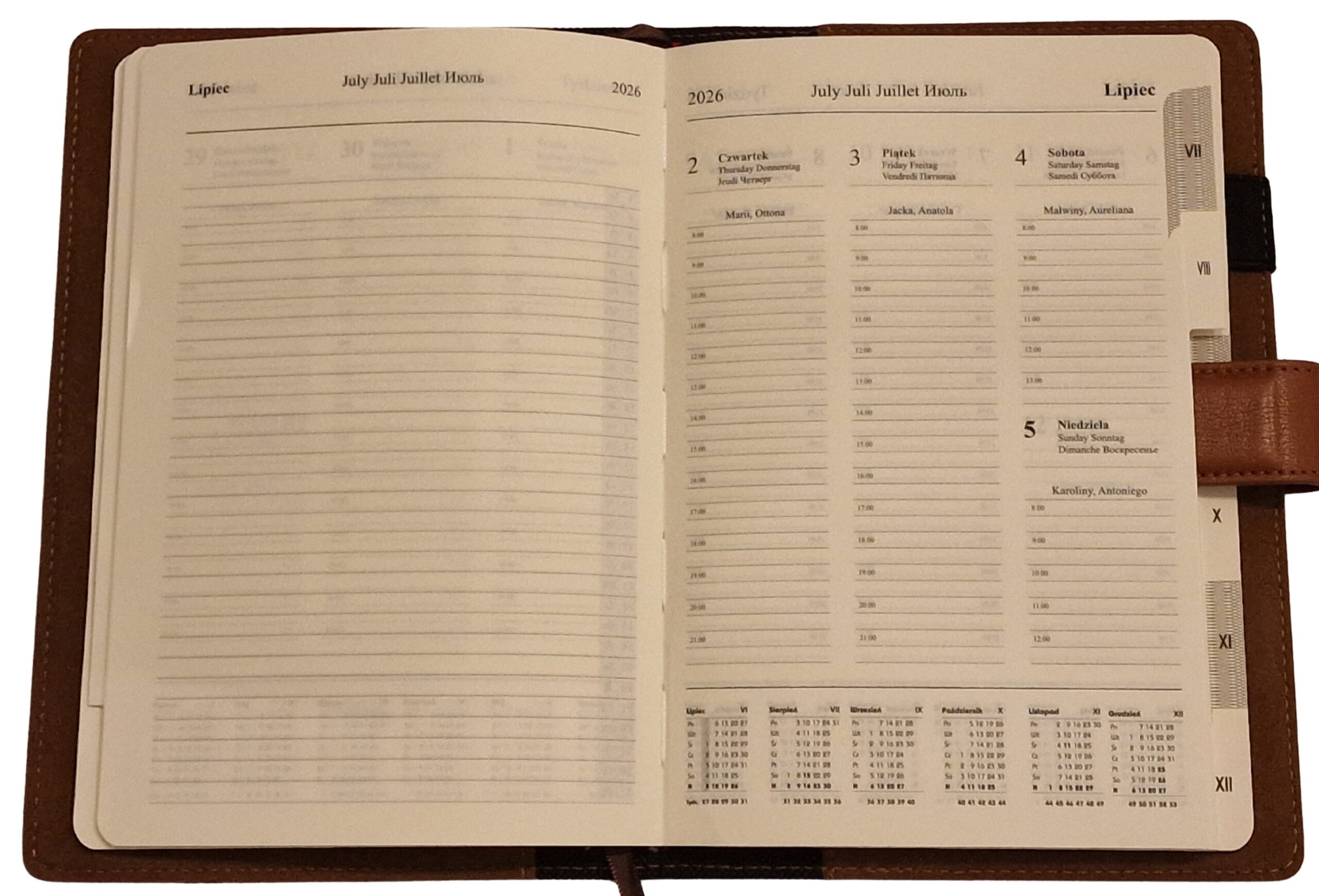 - Dwie dodatkowe strony pomiędzy miesiącami z planem na kolejny miesiąc i na notatki.