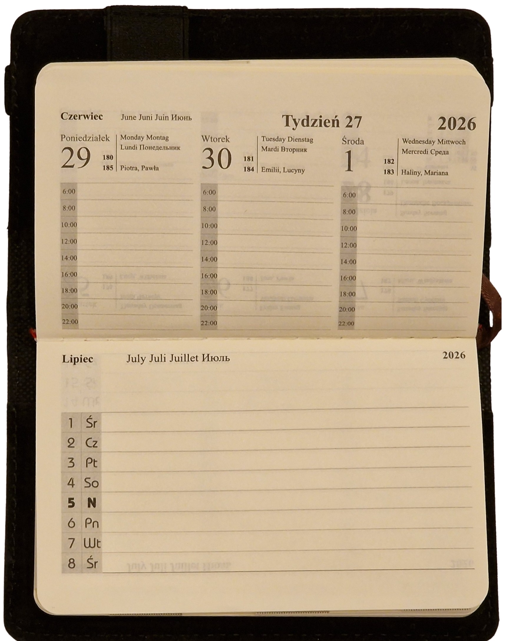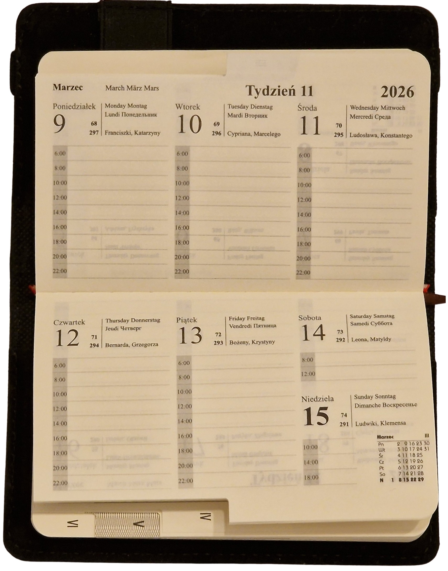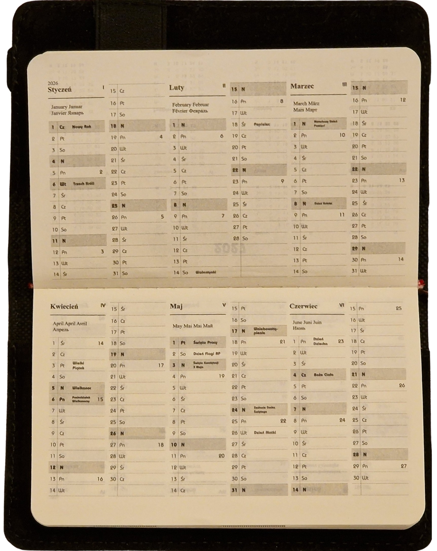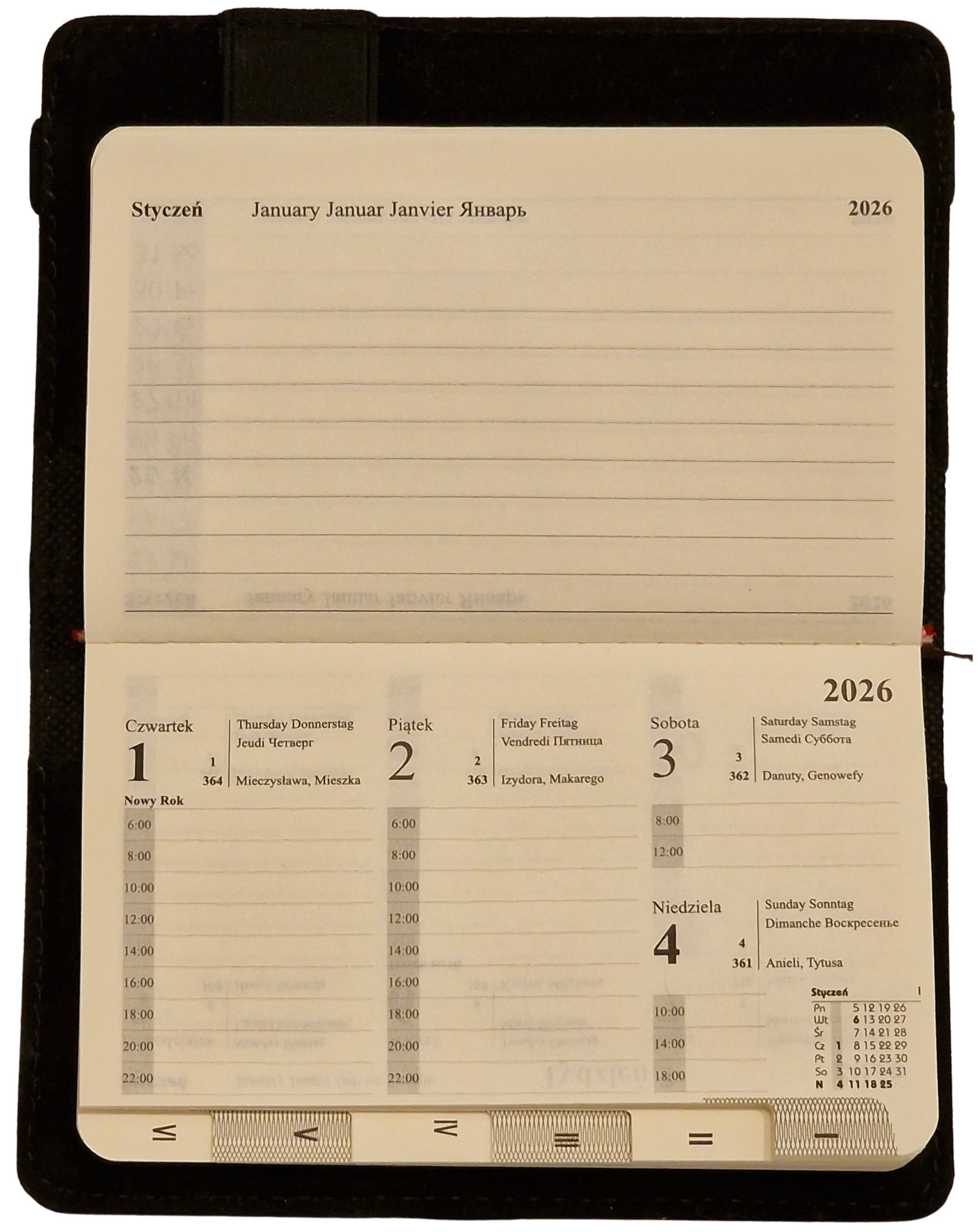 - Układ kalendarza: Dzienny 370 stron lub Tygodniowy 162 strony.