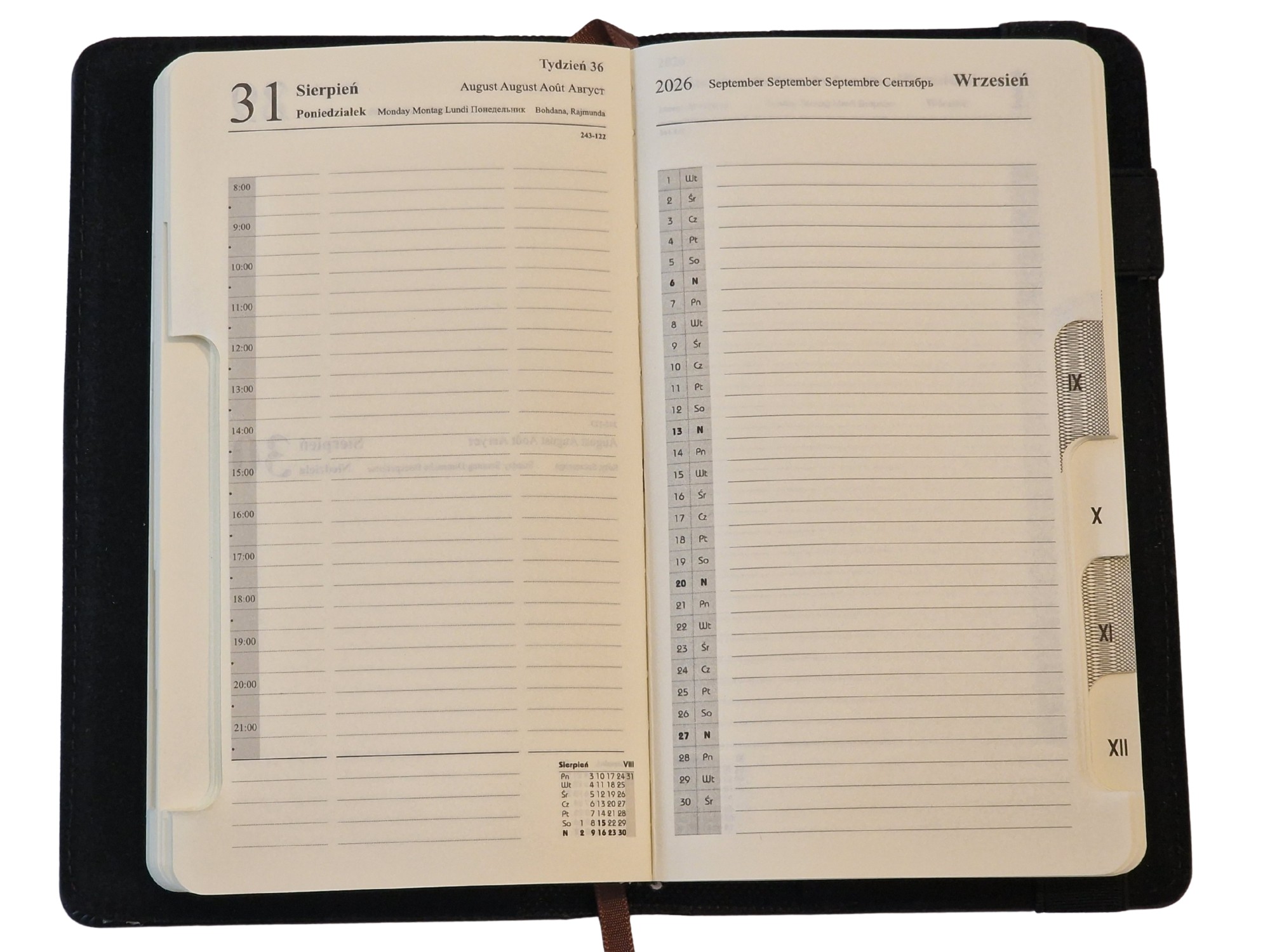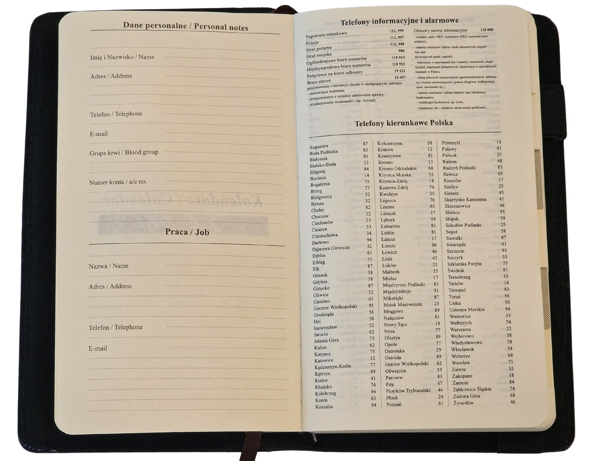 - Układ kalendarza: Dzienny 370 stron lub Tygodniowy 162 strony.